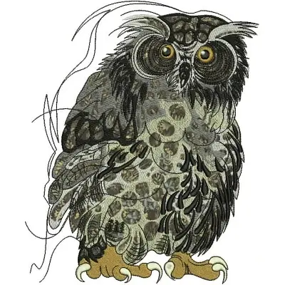 This digital machine embroidery design features a detailed owl featuring intricate feather patterns and prominent eyes. Available in all hoop sizes.