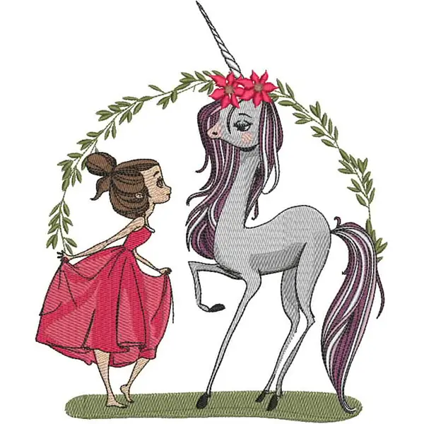 This digital machine embroidery design features a girl in a flowing red dress interacting playfully with a unicorn adorned with flowers. Available in all hoop sizes.