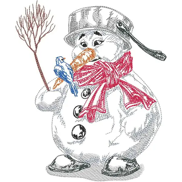 This digital machine embroidery design features a cheerful snowman wearing a striped hat and a red scarf, holding a carrot and accompanied by a bluebird. Available in all hoop sizes.