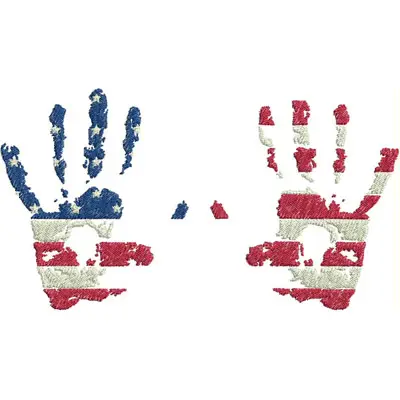 This digital machine embroidery design features two hands, one adorned with blue and white stripes and the other with red and white stripes, reflecting a patriotic theme. Available for 5X7 hoops.