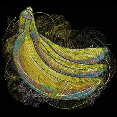 This digital machine embroidery design features a bunch of vibrant yellow bananas with intricate stitching details. Available for 5X7 hoops.