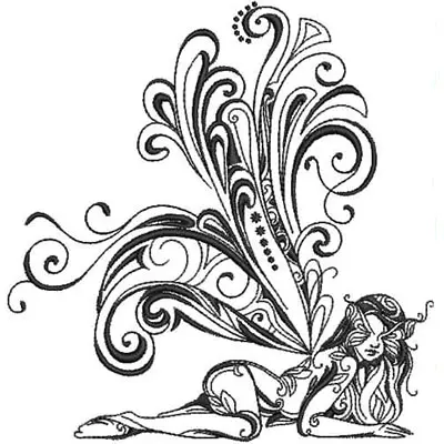 This embroidery design features a reclining fairy with intricate swirls and whimsical patterns emanating from her wings. Available in all hoop sizes.
