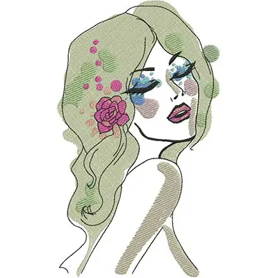 This digital machine embroidery design features a stylized woman with flowing hair adorned with flowers and artistic makeup accents. Available in all hoop sizes.