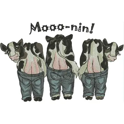 This embroidery design features three cartoon cows wearing jeans, playfully showcasing their backsides with the text "Mooo-nin!" above them.