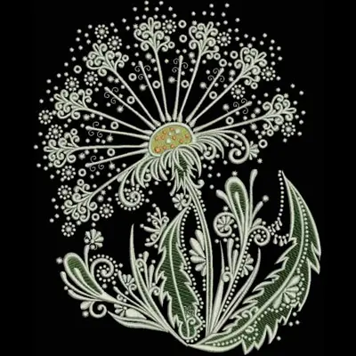 This digital machine embroidery design features a detailed, whimsical daisy-like flower with intricate petals and leafy embellishments. Available in all hoop sizes.