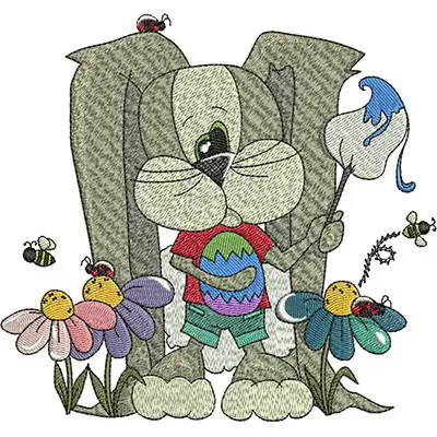 An embroidery design of a cute bunny holding a cotton candy stick while standing among colorful flowers and buzzing bees..