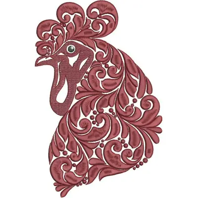 This digital machine embroidery design features a stylized chicken's head adorned with intricate swirls and embellishments. Available in all hoop sizes.