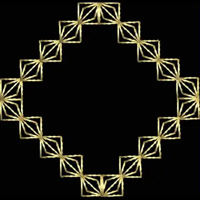 An embroidery design of a geometric frame featuring interlocking diamond shapes arranged in a circular pattern..