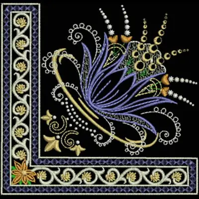 This digital machine embroidery design features an elegant floral motif featuring a prominent blue flower accented by intricate swirls and golden elements at the corner of the piece. Available for 4X4 hoops.