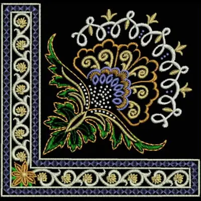This digital machine embroidery design features an intricate floral motif featuring vibrant leaves and layered petals, framed by decorative borders. Available for 4X4 hoops.