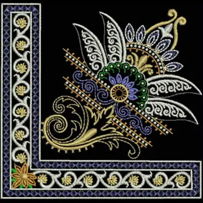 This digital machine embroidery design features an intricate corner motif featuring elegant floral elements, decorative swirls, and vibrant colors. Available for 4X4 hoops.