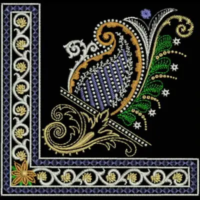 This digital machine embroidery design features an ornate corner motif featuring intricate swirls, colorful leaves, and floral elements. Available for 4X4 hoops.