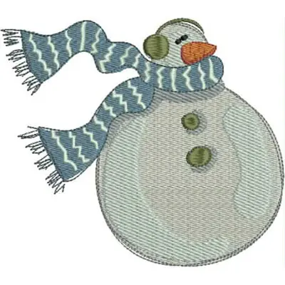 This digital machine embroidery design features a cheerful snowman wearing a patterned scarf, featuring a carrot-shaped nose and button details. Available in all hoop sizes.