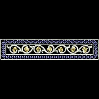 This digital machine embroidery design features intricate swirling vines adorned with golden accents, bordered by a decorative purple frame. Available for 4X4 hoops.