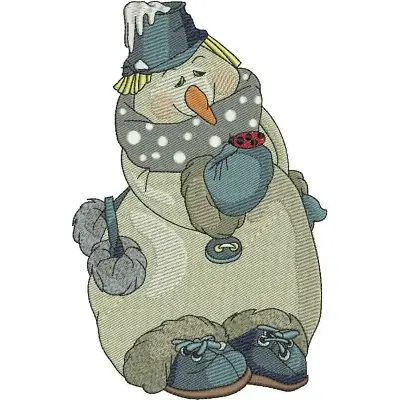 This digital machine embroidery design features a cheerful snowman wearing a hat and scarf, holding a ladybug while adorned in cozy winter attire. Available in all hoop sizes.