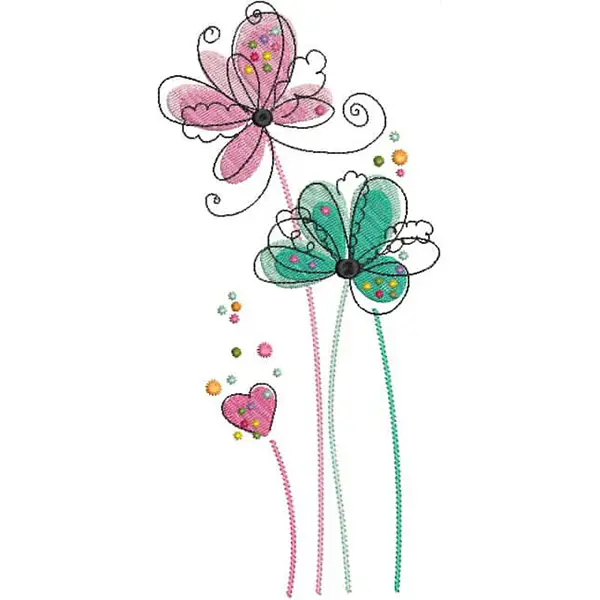 This embroidery design features colorful butterflies with floral accents and a heart, featuring playful outlines and vibrant stitching. Available in all hoop sizes.