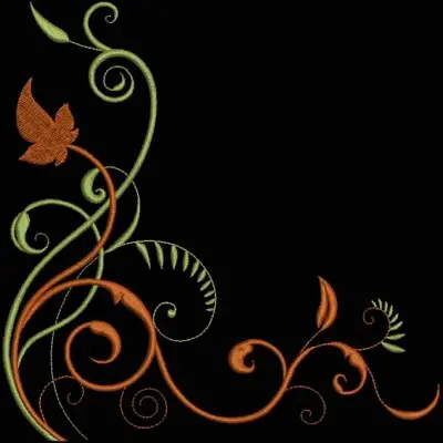 This digital machine embroidery design features intertwining vines and leaves in shades of green and orange, featuring a stylized butterfly. Available in all hoop sizes.