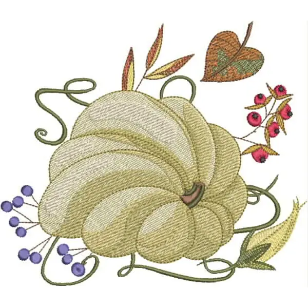 This embroidery design features a pale green pumpkin surrounded by stylized leaves, berries, and tendrils. Available in all hoop sizes.