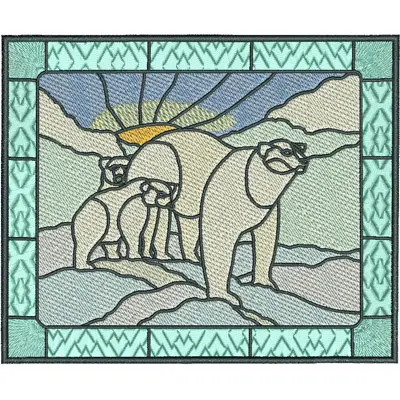 This digital machine embroidery design features a mother polar bear and her two cubs depicted in a stylized, stained glass-inspired style. Available for 5X7 hoops.