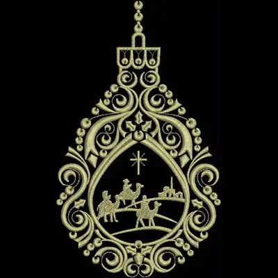 This digital machine embroidery design features a stylized ornament featuring three figures on camels, framed by intricate swirls and a star above. Available in all hoop sizes.