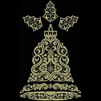 This embroidery design features an ornate Christmas bell adorned with intricate swirls and topped with holly leaves. Available in all hoop sizes.