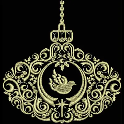 This digital machine embroidery design features an ornate circular motif featuring a dove surrounded by decorative swirls and stars. Available in all hoop sizes.