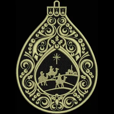 This digital machine embroidery design features a teardrop shape featuring ornate swirls and a scene depicting three camels traveling under a star. Available in all hoop sizes.