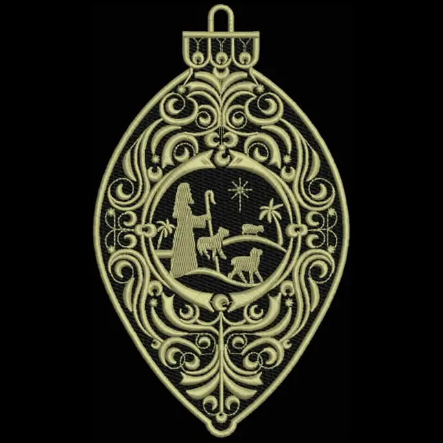 This embroidery design features a shepherd with animals, surrounded by ornate floral patterns and a star, depicted within an oval frame. Available in all hoop sizes.
