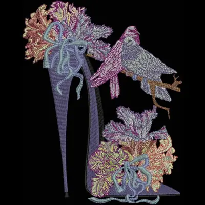 This digital machine embroidery design features a stylish high-heeled shoe adorned with vibrant floral elements and a decorative bird perched on it. Available in all hoop sizes.