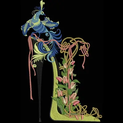 This digital machine embroidery design features a high-heeled shoe adorned with vibrant flowers and a decorative bird perched on top. Available in all hoop sizes.