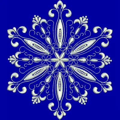 This digital machine embroidery design features an intricate snowflake composed of delicate patterns and swirls, embellished with bead-like accents. Available in all hoop sizes.