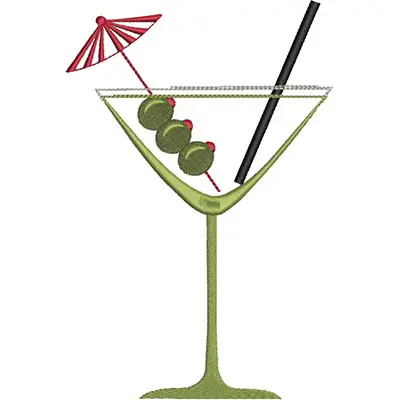 This digital machine embroidery design features a cocktail glass featuring green olives, a red umbrella, and a black straw. Available in all hoop sizes.