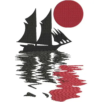 This digital machine embroidery design features a silhouette of a sailing ship with billowing sails, accompanied by a large red sun reflected in the water. Available in all hoop sizes.