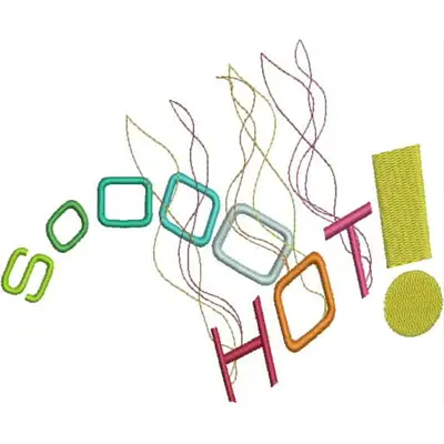 This digital machine embroidery design features playful text reading "SOOOOO HOT!" with colorful letters and dynamic shapes. Available for 5X7 hoops.