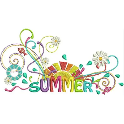 An embroidery design of the word "SUMMER" in vibrant colors, adorned with playful swirls, flowers, and a sun motif.