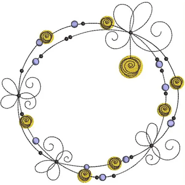 This digital machine embroidery design features a circular arrangement featuring stylized flowers, spirals, and beads in yellow and purple hues intertwined with delicate black lines. Available in all hoop sizes.