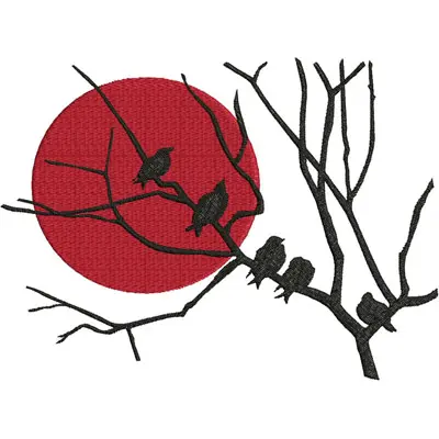This digital machine embroidery design features silhouettes of birds perched on a bare tree branch with a large red circle in the background. Available in all hoop sizes.