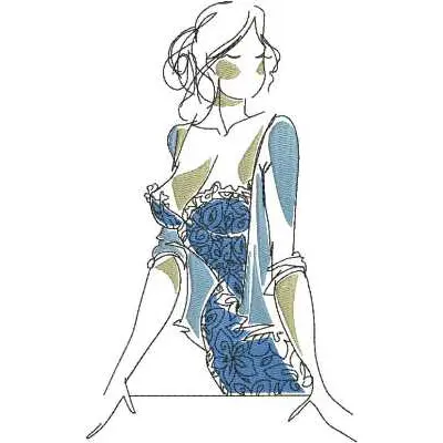 This digital machine embroidery design features a stylish woman in a detailed blue dress with floral patterns and ruffled accents. Available in all hoop sizes.
