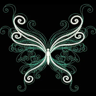 This digital machine embroidery design features an intricate butterfly with swirling patterns and detailed wing formations. Available in all hoop sizes.