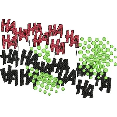 This digital machine embroidery design features playful "ha" phrases in red and black, complemented by vibrant green circular embellishments. Available in all hoop sizes.