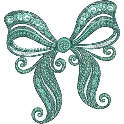 This digital machine embroidery design features an elegantly crafted teal bow featuring intricate swirls and pearl-like embellishments. Available for 5X5 hoops.