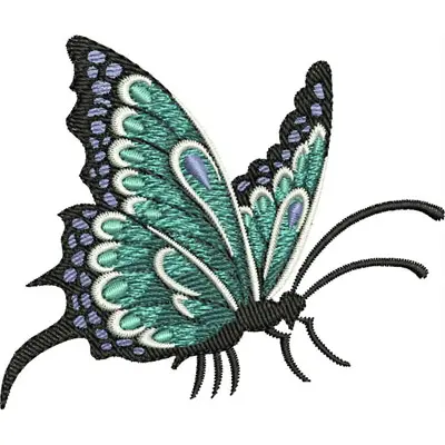 This digital machine embroidery design features a vibrant teal butterfly with intricate detailing and contrasting black accents. Available for 4X4 hoops.