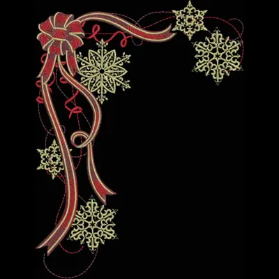 This digital machine embroidery design features a decorative bow with flowing ribbons and intricate snowflake motifs in red and gold. Available in all hoop sizes.