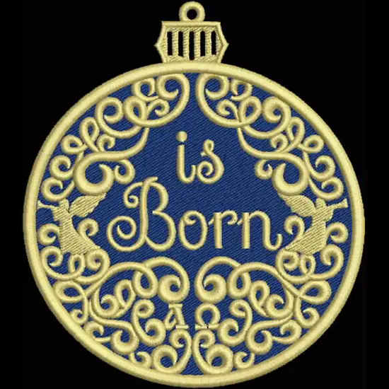 This digital machine embroidery design features intricate swirling patterns featuring the words "is Born" prominently in the center, surrounded by decorative elements. Available in all hoop sizes.