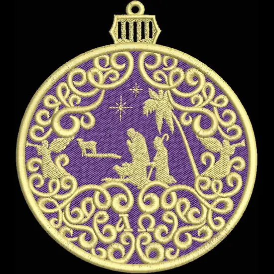 This digital machine embroidery design features a nativity scene enclosed in intricate golden swirls on a purple background. Available in all hoop sizes.