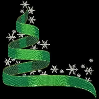 This digital machine embroidery design features a green ribbon spiraling upward to form a Christmas tree, adorned with white snowflakes. Available in all hoop sizes.
