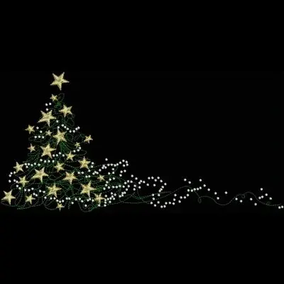 This digital machine embroidery design features a festive Christmas tree adorned with gold stars and delicate white beads, featuring flowing green vines. Available in all hoop sizes.