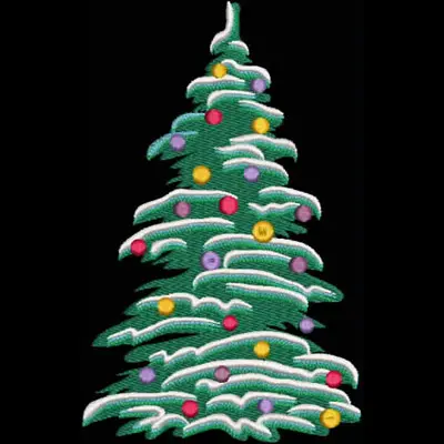 This embroidery design features a green Christmas tree adorned with colorful ornaments and topped with white snow-like accents. Available in all hoop sizes.
