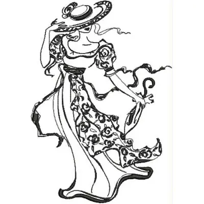 This digital machine embroidery design features a graceful lady in a flowing dress adorned with floral patterns, elegantly holding a hat and an accessory. Available in all hoop sizes.