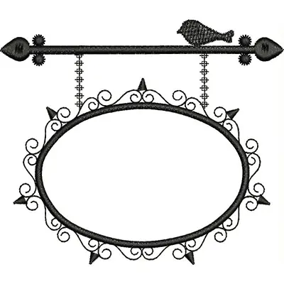 This digital machine embroidery design features an ornate black frame with decorative swirls and a small bird perched above it. Available in all hoop sizes.